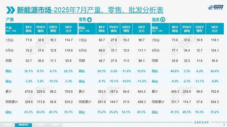 繼續上數據,我們先看零售,7月純電銷量為60.7萬輛,同比增長24.5%;插混銷量為27.8萬輛,同比下滑0.2%;增程銷量為10.2萬輛,同比下滑11.4%。