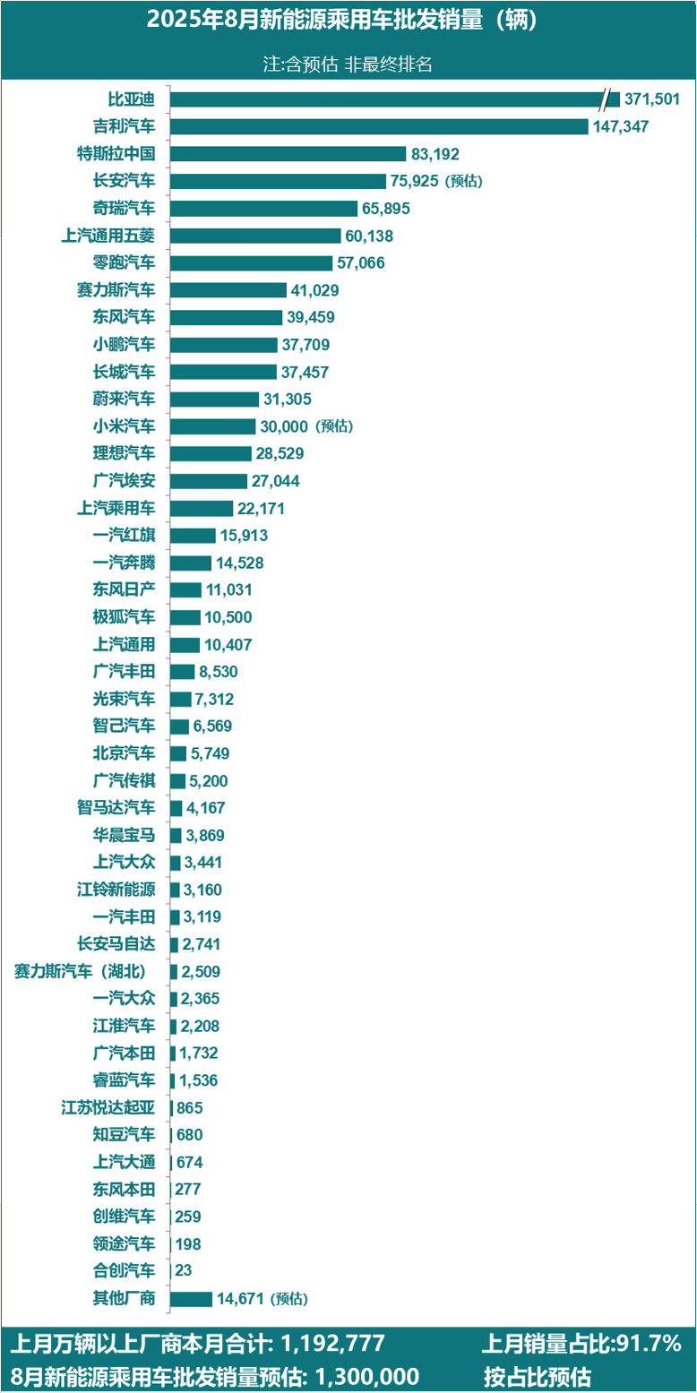根據(jù)乘聯(lián)分會(huì)數(shù)據(jù),全國乘用車市場7月新能源批發(fā)銷量萬輛以上的廠商銷量之和,占總體新能源乘用車當(dāng)月銷量的91.7%。根據(jù)月初匯總數(shù)據(jù),這些廠商的8月銷量為119萬輛。目前絕大部分廠商銷量基本都已經(jīng)鎖定,因此按照上月結(jié)構(gòu)占比結(jié)合本月數(shù)據(jù),測算8月的全國新能源乘用車批發(fā)銷量為130萬輛,同比增長24%,環(huán)比增長10%。