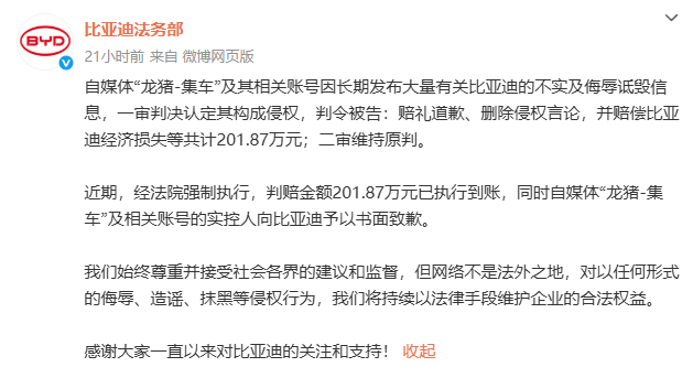 近期,經(jīng)法院強(qiáng)制執(zhí)行,判賠金額201.87萬元已執(zhí)行到賬,同時(shí)自媒體“龍豬-集車”及相關(guān)賬號的實(shí)控人向比亞迪予以書面致歉。我們始終尊重并接受社會(huì)各界的建議和監(jiān)督,但網(wǎng)絡(luò)不是法外之地,對于任何形式的侮辱、造謠、抹黑等侵權(quán)行為,將持續(xù)以法律手段維護(hù)企業(yè)的合法權(quán)益。