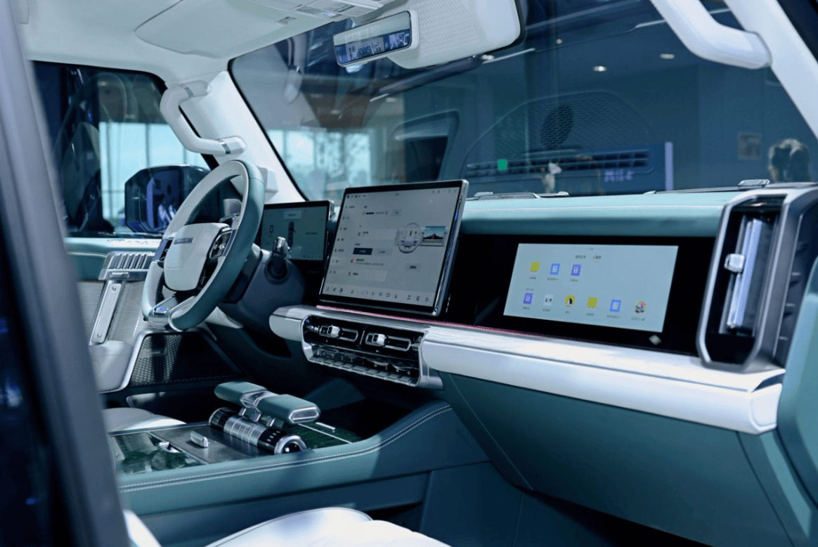 全車6塊大屏,科技感爆棚。10.25英寸儀表屏、 15.6英寸中控、W-HUD抬頭顯示、流媒體內后視鏡、后排控制屏等,前后排都可以自由控制座椅、空調、天窗遮陽簾等。飛航旋鈕,可以切換多種駕駛模式:標準/運動/AUTO/雪地/深雪/泥地/巖石/沙地/涉水——從這里也不難看出,猛士M817走過的路,是很多汽車到不了的遠方。