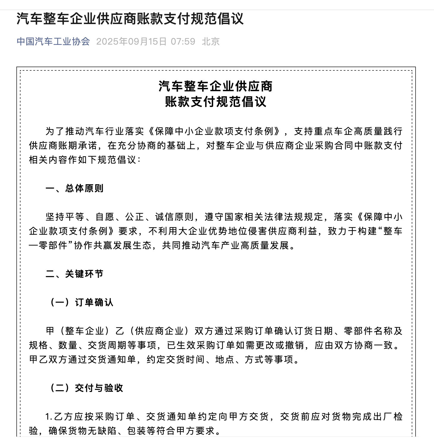 9月15日,中國汽車工業協會(簡稱“中汽協”)發布《汽車整車企業供應商賬款支付規范倡議》,此舉為了推動汽車行業落實《保障中小企業款項支付條例》,支持重點車企高質量踐行供應商賬期承諾。