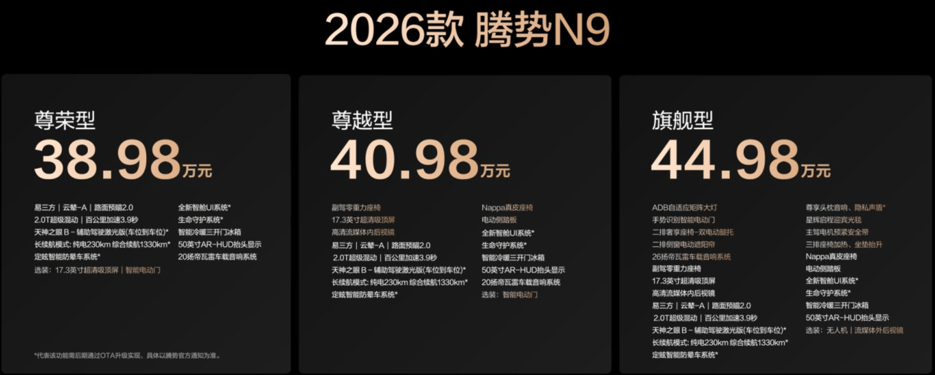 在如今的40萬級豪華SUV市場,似乎陷入了一場詭異的“軍備競賽”——你加一塊屏,我多一張真皮;你說續航破千,我喊加速進4秒。但很少有人追問:當這些參數堆砌到極致,豪華的本質到底是什么?9月17日,2026款騰勢N9的上市,給出了一個顛覆性答案:真正的豪華,是讓技術俯身服務于人,讓場景貼合每一種人生角色。這款定價38.98萬-44.98萬元的旗艦SUV,攜尊榮型、尊越型、旗艦型三款車型而來,既沒靠“聯名限量”炒作溢價,也沒拿“偽智能”忽悠消費者,而是用“安全可驗證、舒適可感知、智能可落地”的硬實力,撕開了當前豪華車市場的“虛假繁榮”。