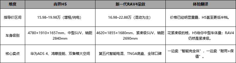 你買尚界H5,是在押注“未來體驗”;你買RAV4榮放,是在續費“過去十年的確定性”。看重哪一邊,就選誰。