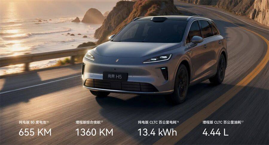尚界H5:增程版15.98萬起,純電版16.58萬起,全系上來就給你中型SUV的車身、鴻蒙座艙,增程版綜合續航1360km、油耗4.44L/100km。