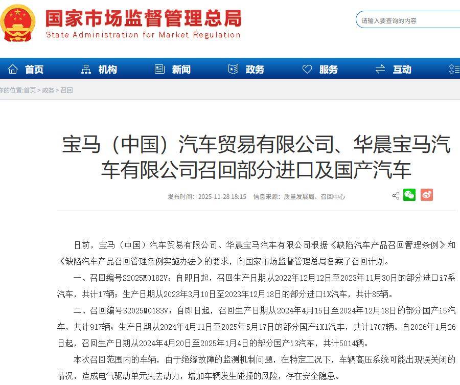 11月28日,國(guó)家市場(chǎng)監(jiān)督管理總局發(fā)布消息,寶馬汽車(chē)召回多款電動(dòng)汽車(chē),含i7/iX/i5/iX1/i3,主要原因電氣驅(qū)動(dòng)單元存在失去動(dòng)力風(fēng)險(xiǎn)。